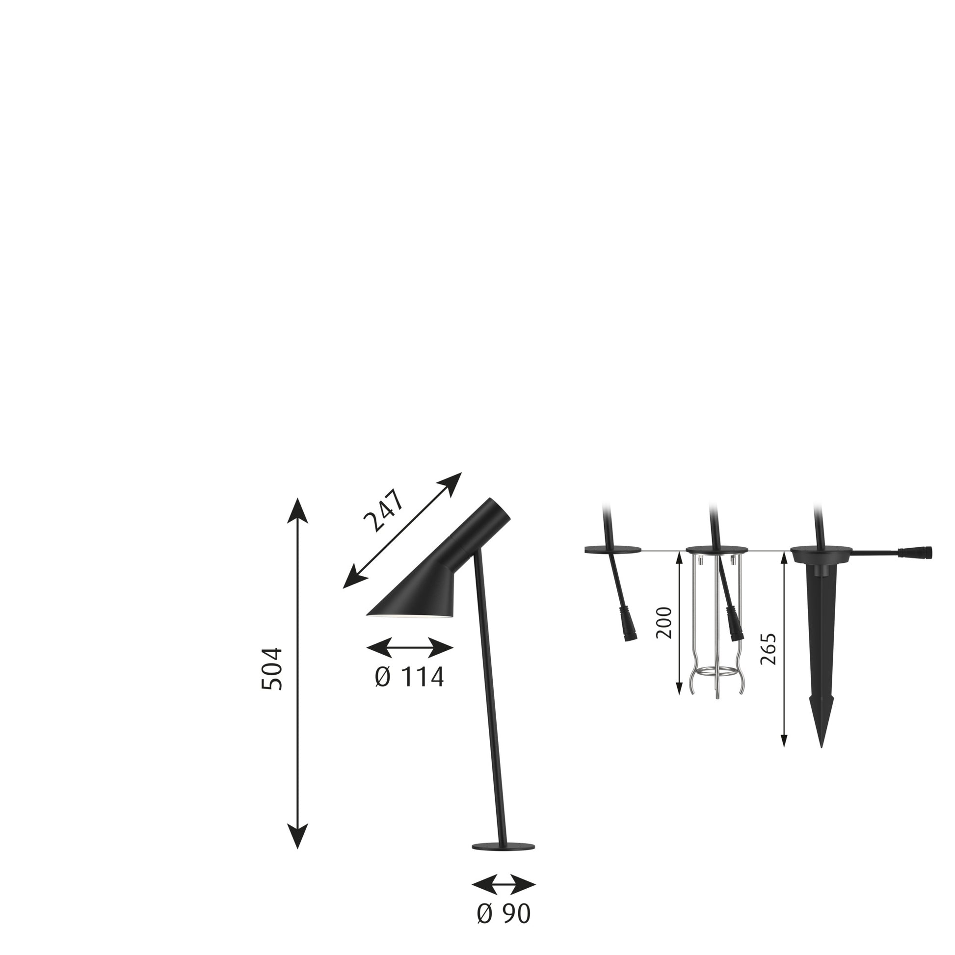 Mål: Skærm: 114 x 125 x 246,5 mm. Mast: Ø 12 mm. Fodplade: Ø 90 mm.Total højde kort variant: 504 mm. Total højde lang variant: 954 mm.
