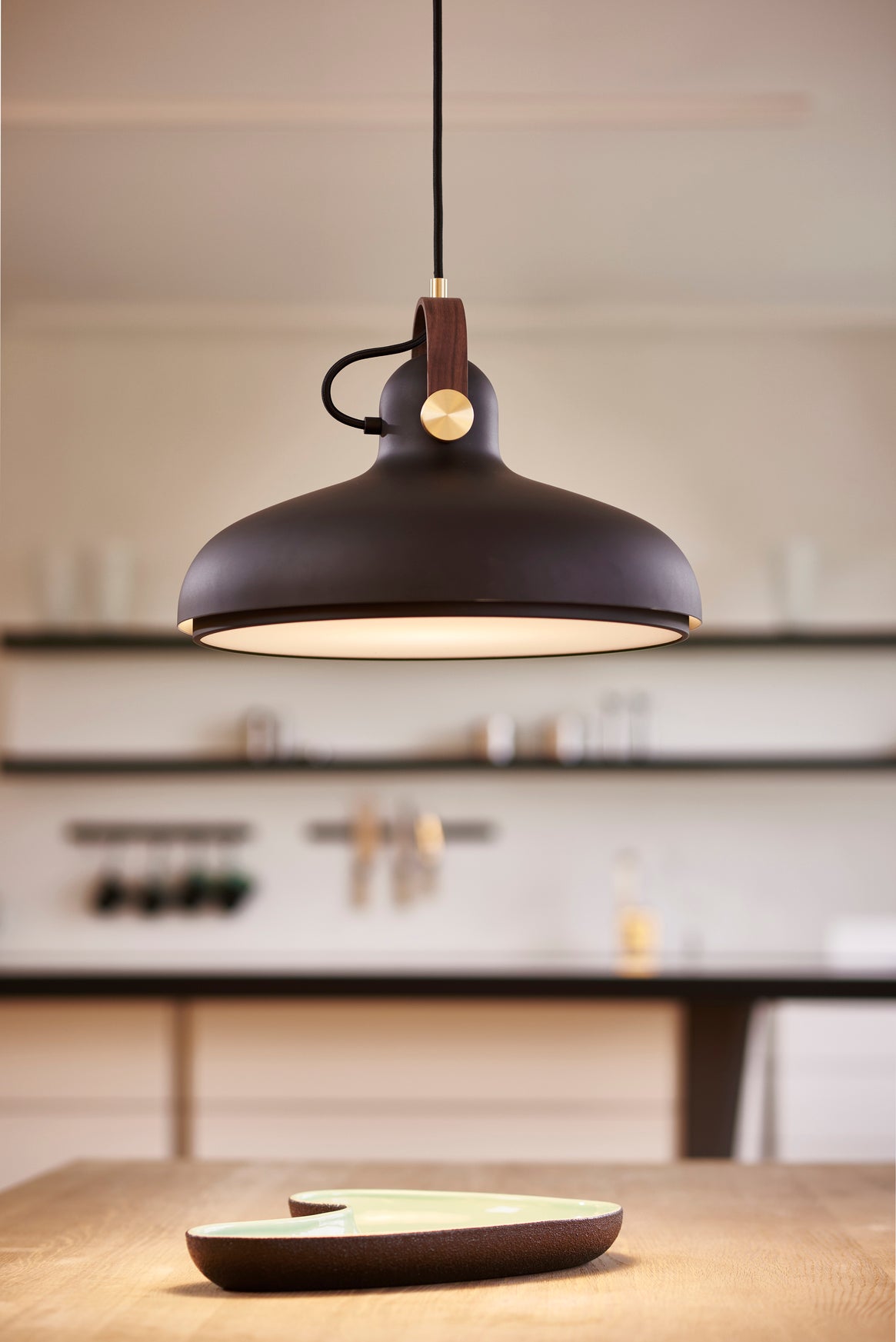 Denne størrelse er specielt velegnet over mødeborde eller over spisebordet. Lampen fungerer både alene eller flere sammen. Lampen har en stor åbning, men har en diffuser under, så den ikke blænder.