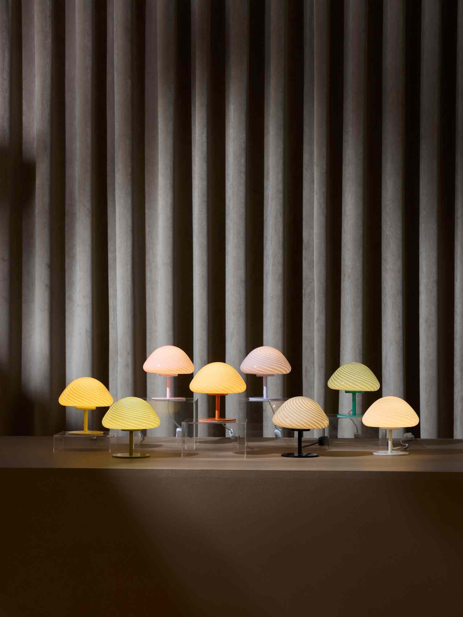 Mini Mush er en skøn lille bordlampe til strøm og med en G9 lyskilde. Mini Mush fås i flere skønne farver og skaber en hyggelig stemning med sin lampeskærm med stribet glas.