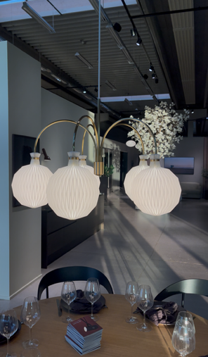 Med sit unikke formsprog spreder lysekronen et blødt, behageligt og 100 % blændfrit lys, der gør den perfekt til at hænge over spisebordet, i hall’en eller i stuen, hvor den kan fungere som et stemningsfuldt blikfang.
