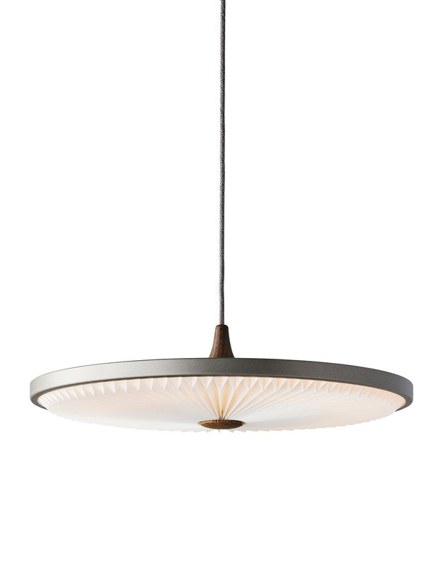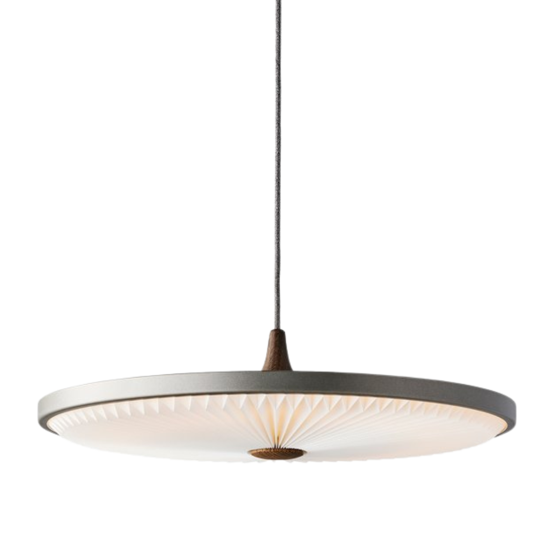 Philip Bro Ludvigsen, der har designet lampen har taget udgangspunkt i den velkendte plisséskærm og tilføjet smukke detaljer i form af træ og aluminium, der giver lampen et meget elegant udseende.