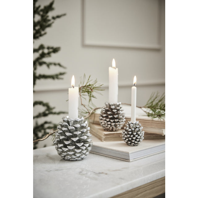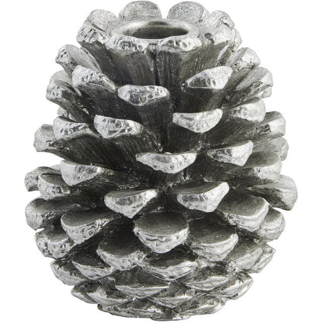 Lysestagen er fremstillet i polyresin, et robust materiale, der giver mulighed for at skabe skarpe detaljer og en eksklusiv finish. Overfladen i antik sølv giver et smukt, let patineret look, som fremhæver kogleformen og gør hvert stykke unikt.