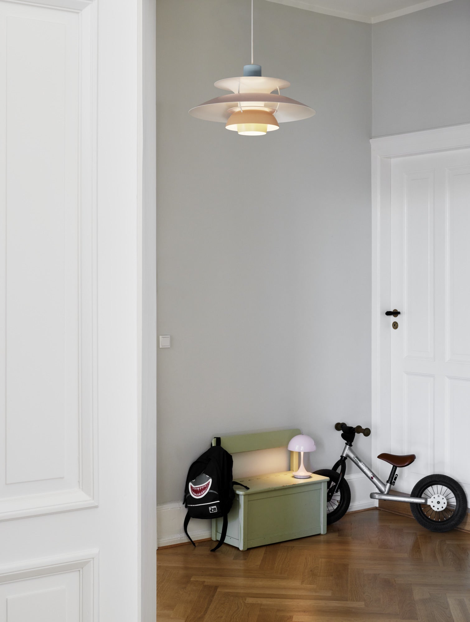 Den klassiske PH 5-lampe fås nu i nye pastelfarver, der passer perfekt til det moderne hjem. PH 5 fås i to pastelfarvekombinationer: østersgrå/blå/rosa og blå/rosa/fersken. Hvis du ønsker et mere enkelt look, kan du vælge en af de monokrome varianter: lys rosa, østersgrå eller hvid.