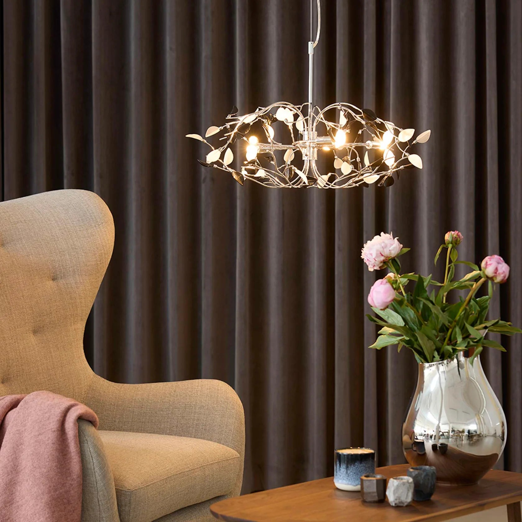Med sin diameter på 66 cm og højde på 35 cm er Iben et imponerende midtpunkt – ideel over spisebordet, i stuen eller i en stor hall, hvor den virkelig kan få lov til at skinne.