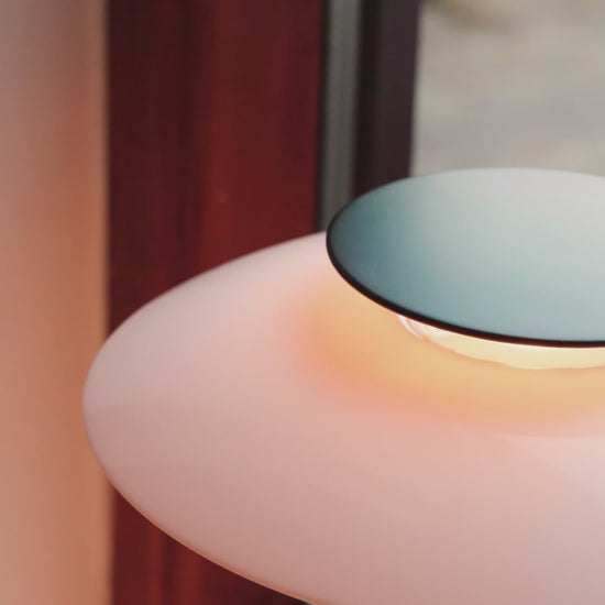 Lampen udsender et diffust og reflekteret lys, hvor størstedelen ledes roligt nedad, mens de opale akrylskærme spreder en varm og indbydende glød i rummet. På den originale model giver den rødlige topreflektor en varm, næsten levende lysstemning, mens den nye hvide version skaber et rent, elegant og nutidigt udtryk.