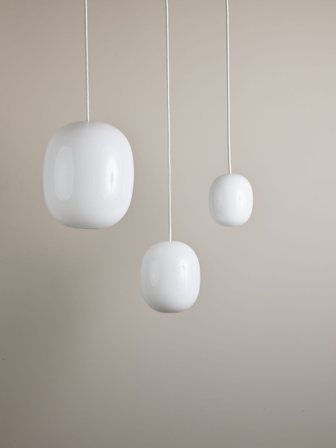 SUPERÆG 150P Pendel har en organisk, strømlinet form, der balancerer det bløde og geometriske. Den er fremstillet af hvidt opalt glas, som sikrer et diffust og behageligt lys, perfekt til både spiseborde, køkkener og stuer.
