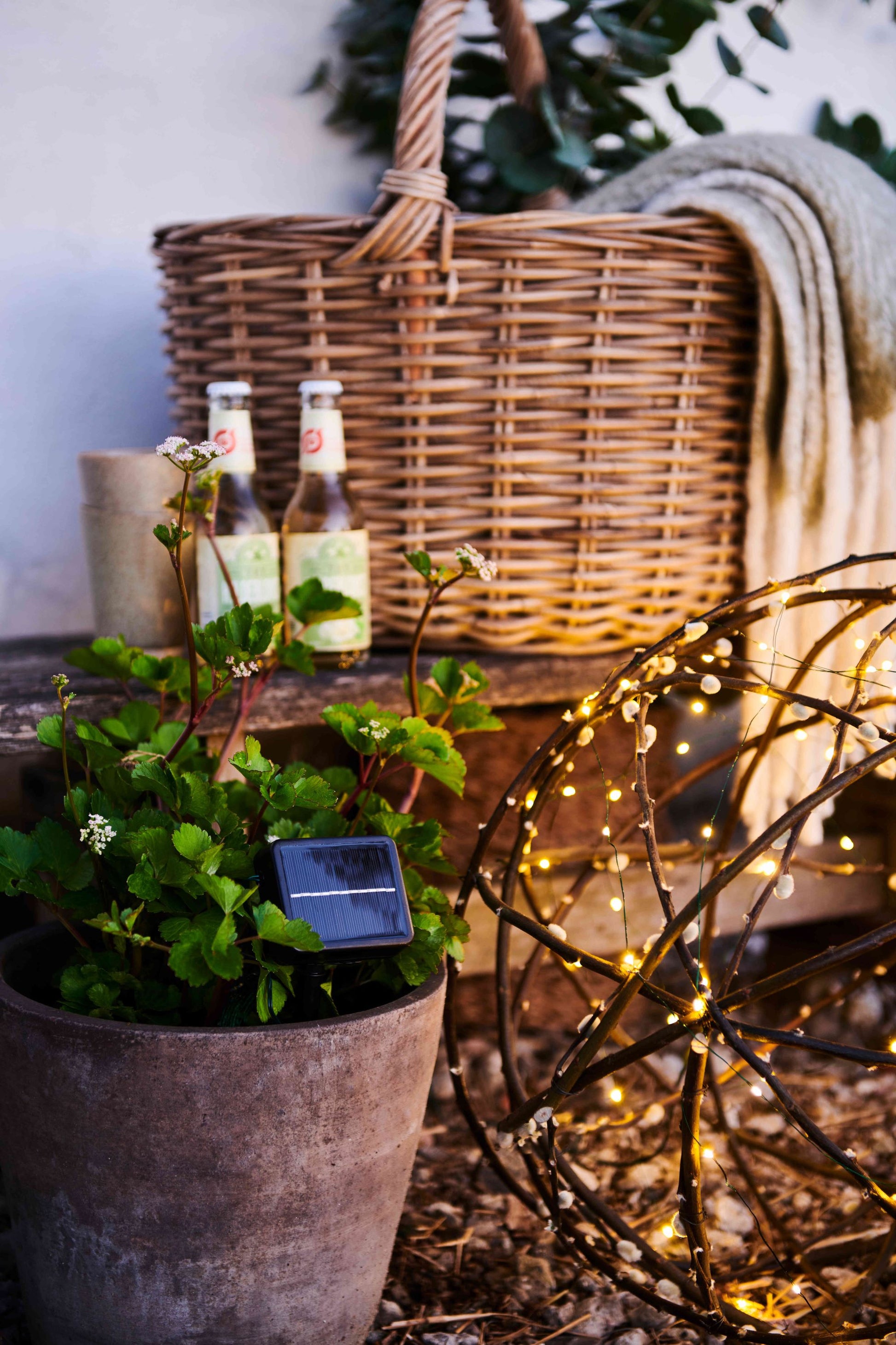 Du kan bruge knirke på mange måder. Det handler kun om at være kreativ. Brug den som borddekoration, i buketter, på træstammer eller i glas. Kæden består af en grøn tråd med LED dioder på. Denne Knirke lyskæde lyser ved hjælp af solcelle panelet, som står ved siden af. Kæden lyser automatisk når mørket falder på, så er derved en dejlig nem måde at dekorere din have. Vi anbefaler at solcelle lys tages med inden for efter sommeren, og behandles som dine havemøbler.