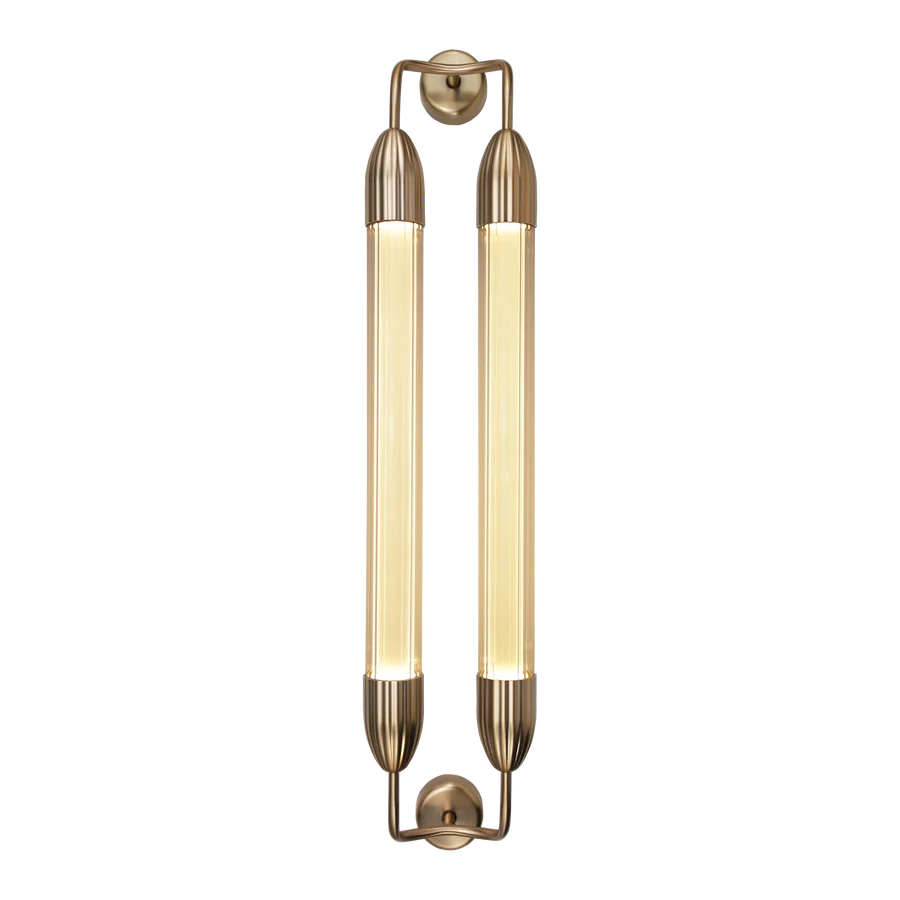 Den lange, slanke konstruktion og den blanke messingfinish tilfører et eksklusivt præg til væggen – perfekt som dekorativ belysning i stue, entre eller soveværelse. Lyset reflekteres smukt i overfladen og giver et varmt og indbydende skær, der fremhæver messingens naturlige glød.