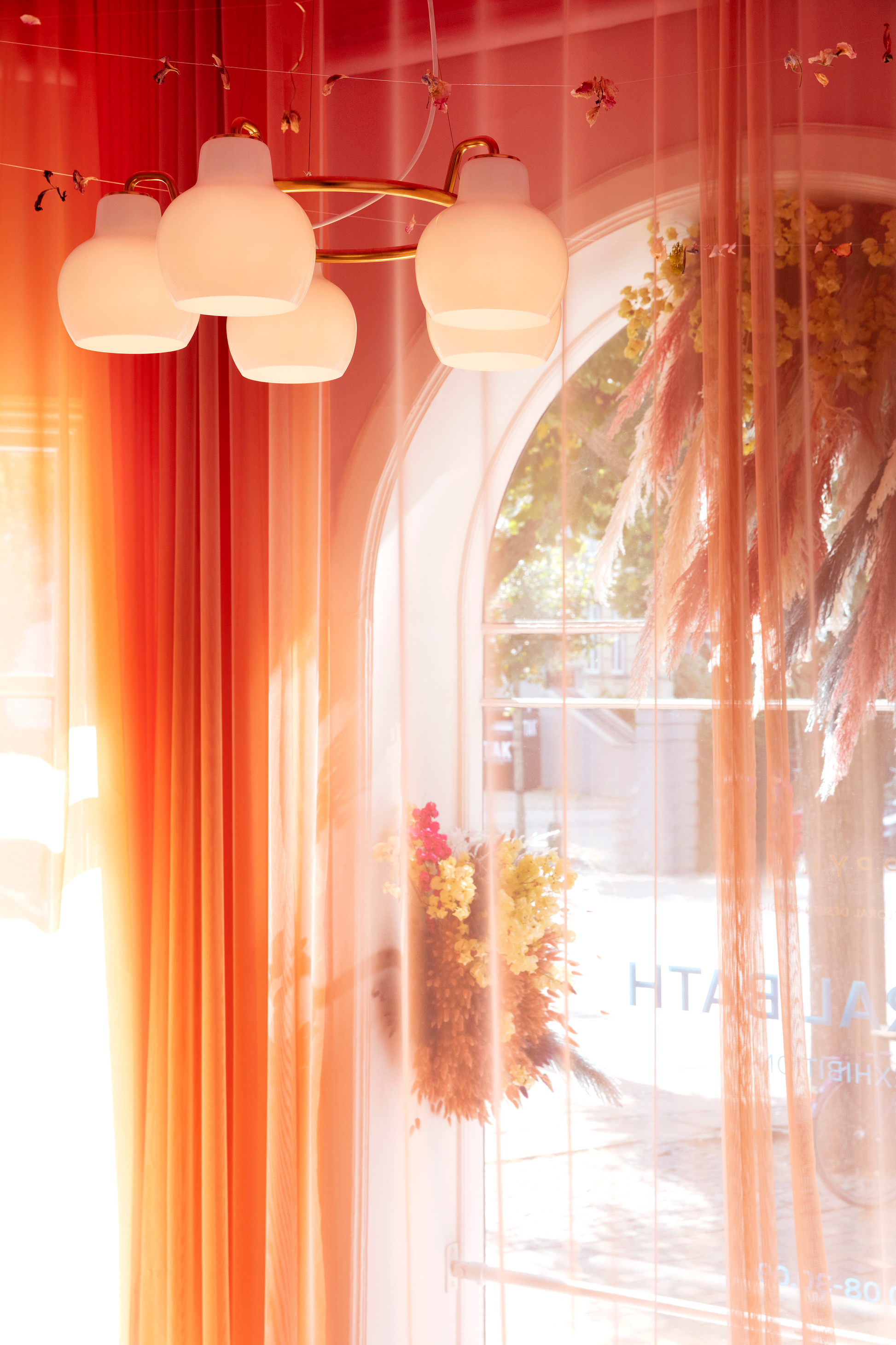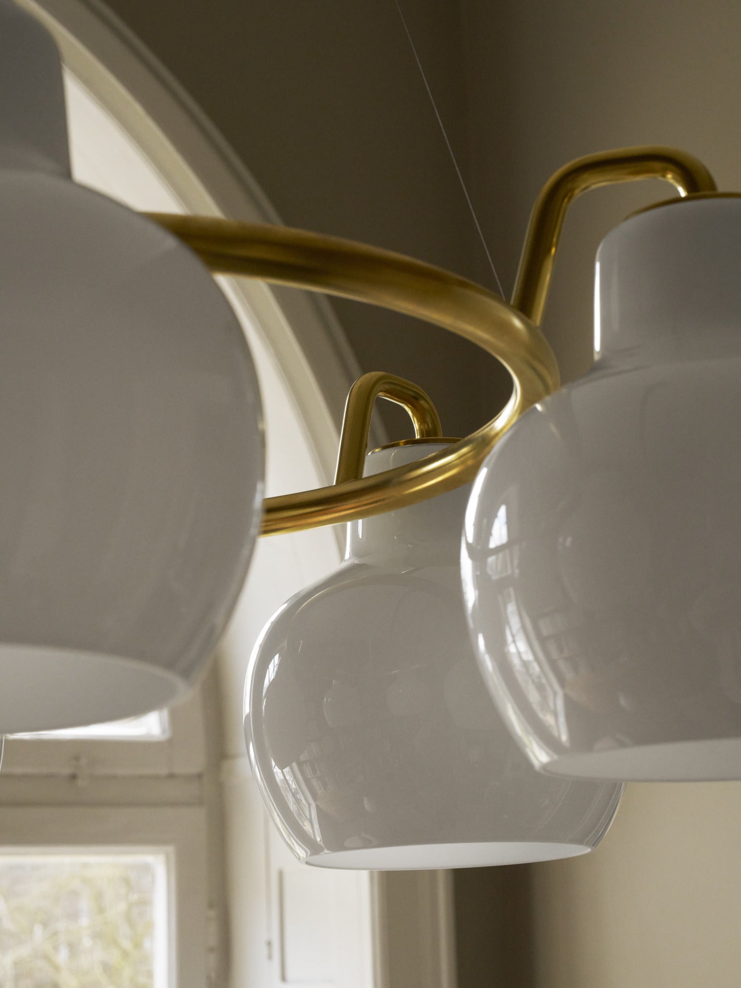 Materialer: Skærme: Mundblæst, poleret, opalt trelagsglas. Stel og baldakin: Satinpoleret messing, ubehandlet.