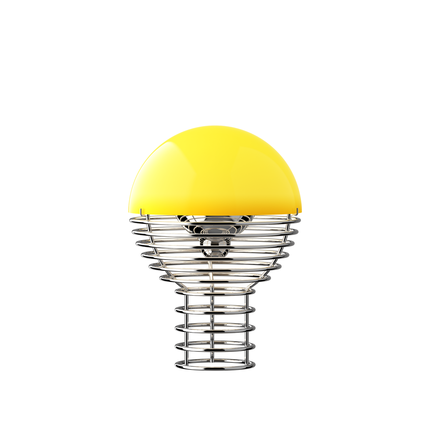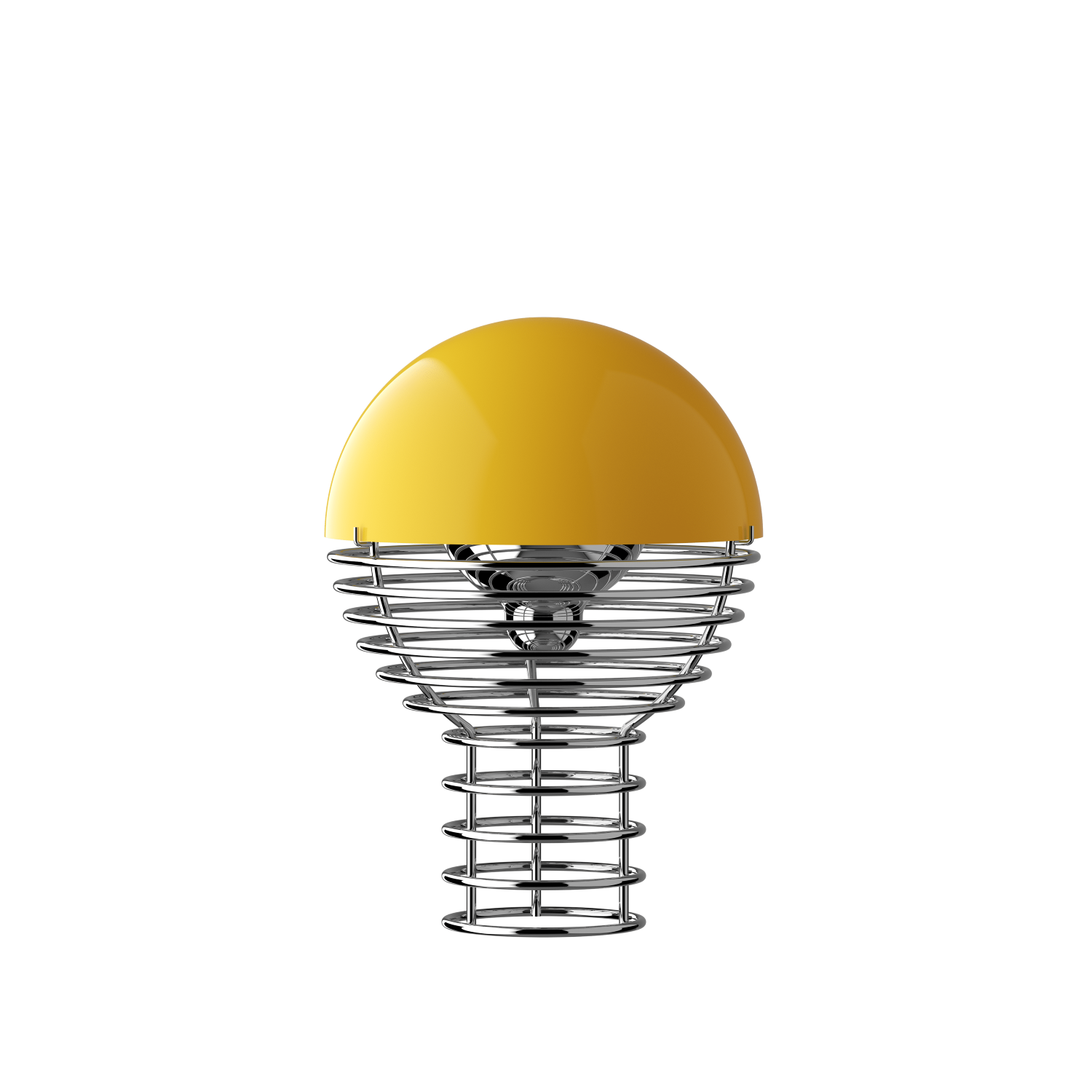 Verpan Wire Genopladelig Bordlampe – Gul er en levende og stilfuld fortolkning af Verner Pantons originale Wire-design fra 1972. Lampen kombinerer ikonisk dansk design med moderne funktionalitet og bærbar frihed – perfekt til dig, der ønsker fleksibel belysning med karakter.