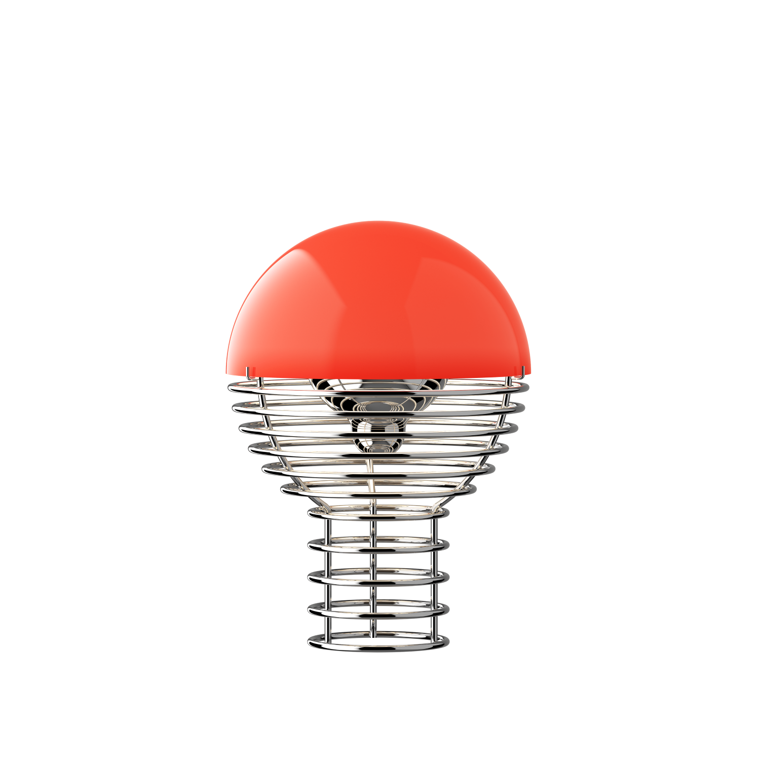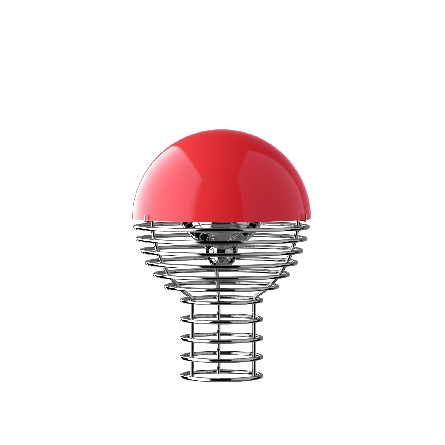 Verpan Wire Genopladelig Bordlampe – Rød er en levende og stilfuld fortolkning af Verner Pantons originale Wire-design fra 1972. Lampen kombinerer ikonisk dansk design med moderne funktionalitet og bærbar frihed – perfekt til dig, der ønsker fleksibel belysning med karakter.
