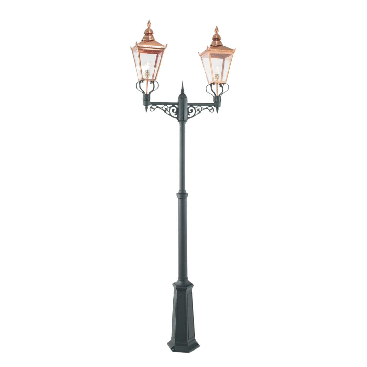 Chelsea 2 stolplampa från Norlys, är av hög kvalitet och har en vacker design. Chelsea är en serie bestående av vägglampor, kedjelampor, portallampor och teleskopstolpar med 1 och 2 lamphuvuden (stolplampa). Lamporna är handgjorda i polerad koppar som efter en tid blir antikgrön/brun. Skärmarna är tillverkade av slagtålig klar polykarbonat. Stolpar och väggarmar är tillverkade av lackerad aluminium och stolparna är lätta att justera i höjdled. Stolpen har kvadratisk bas och levereras exkl. förankringsset, som kan köpas här på sajten.