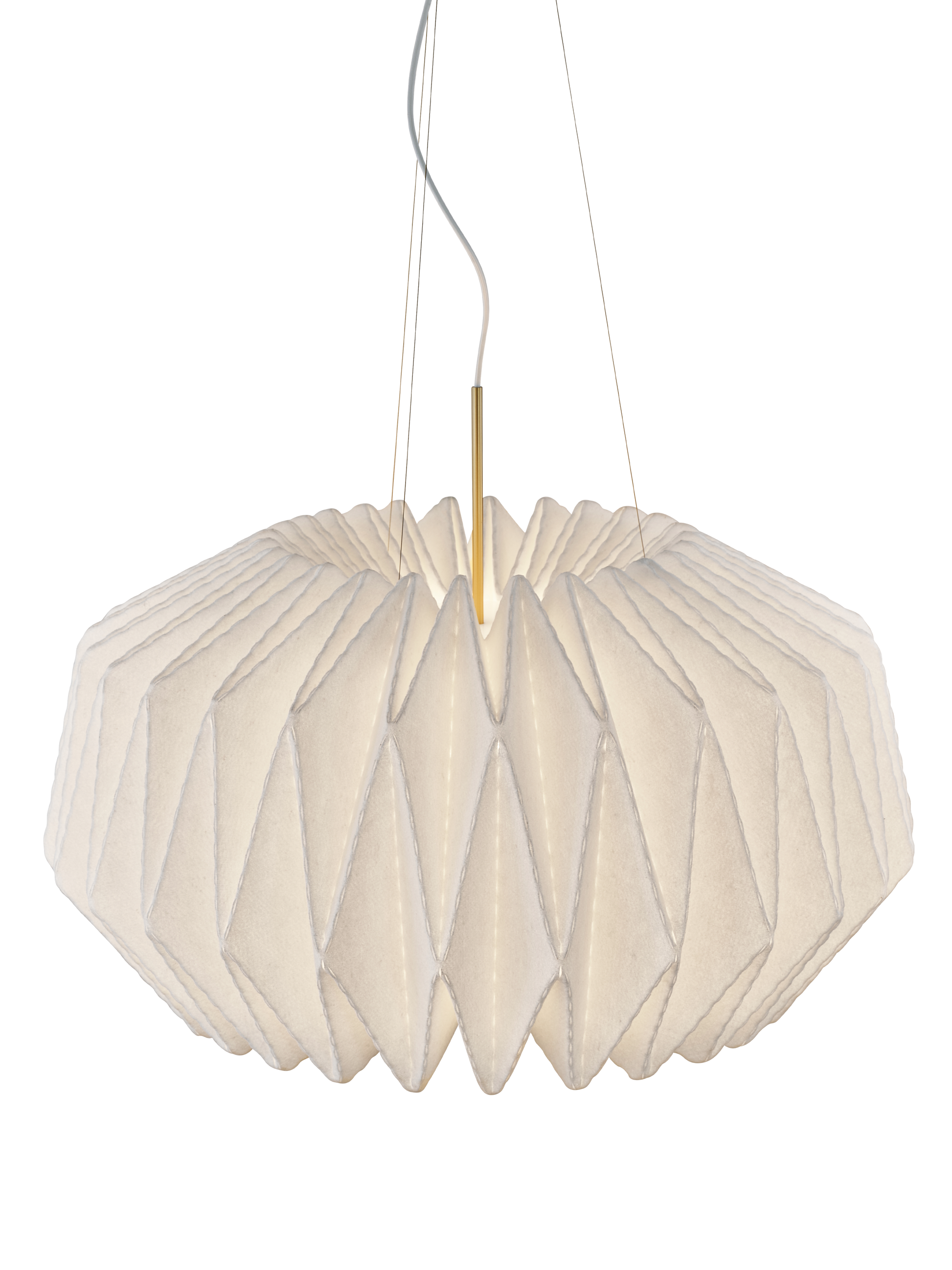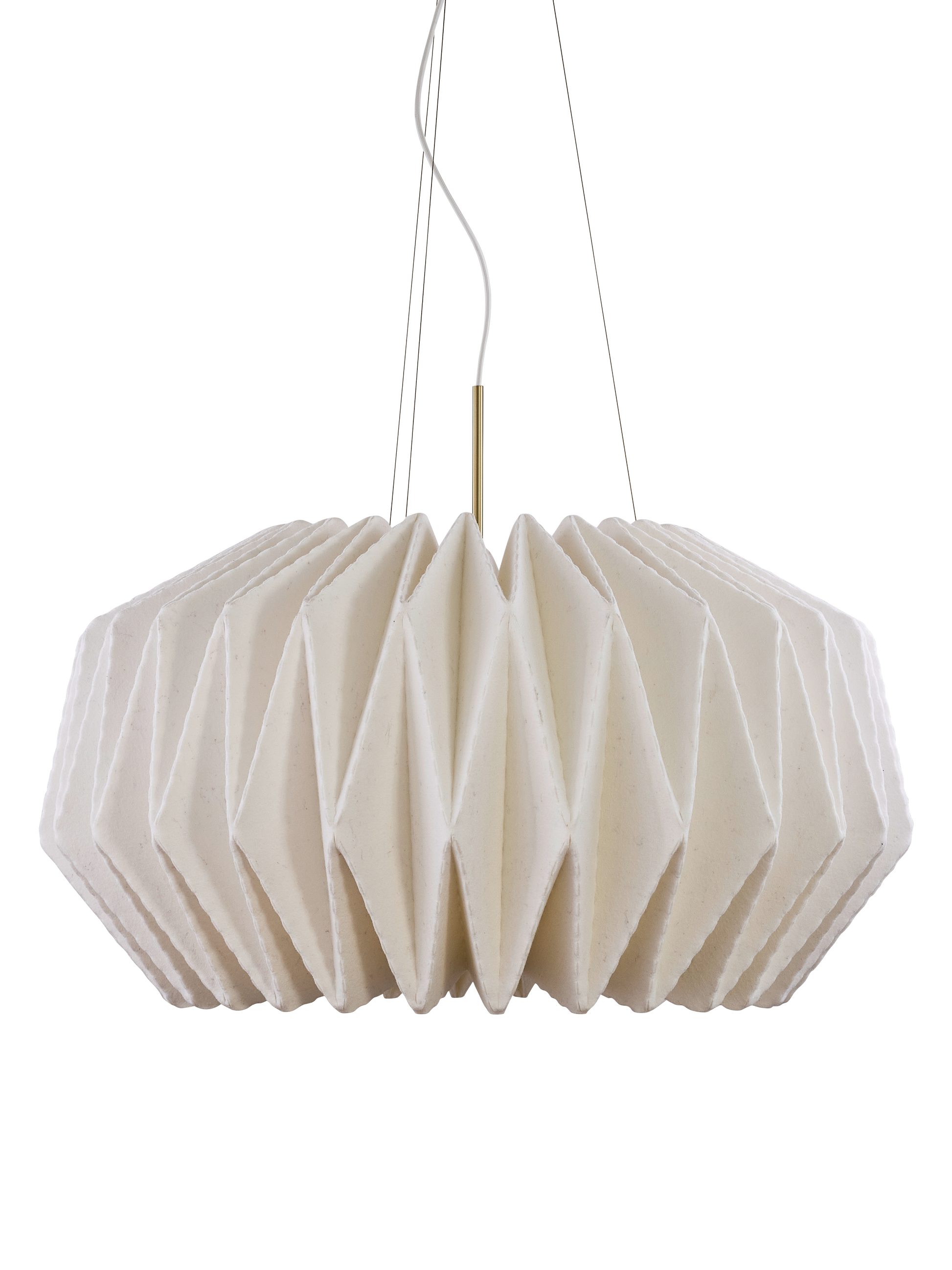 Den håndfoldede skærm i plast kombineret med raffinerede messingdetaljer udstråler klassisk Le Klint-håndværk i en moderne fortolkning. De bløde plisseringer spreder et diffust og behageligt lys, som skaber en varm og indbydende atmosfære – ideel over spisebordet, i hall’en eller i store stuer med højt til loftet.