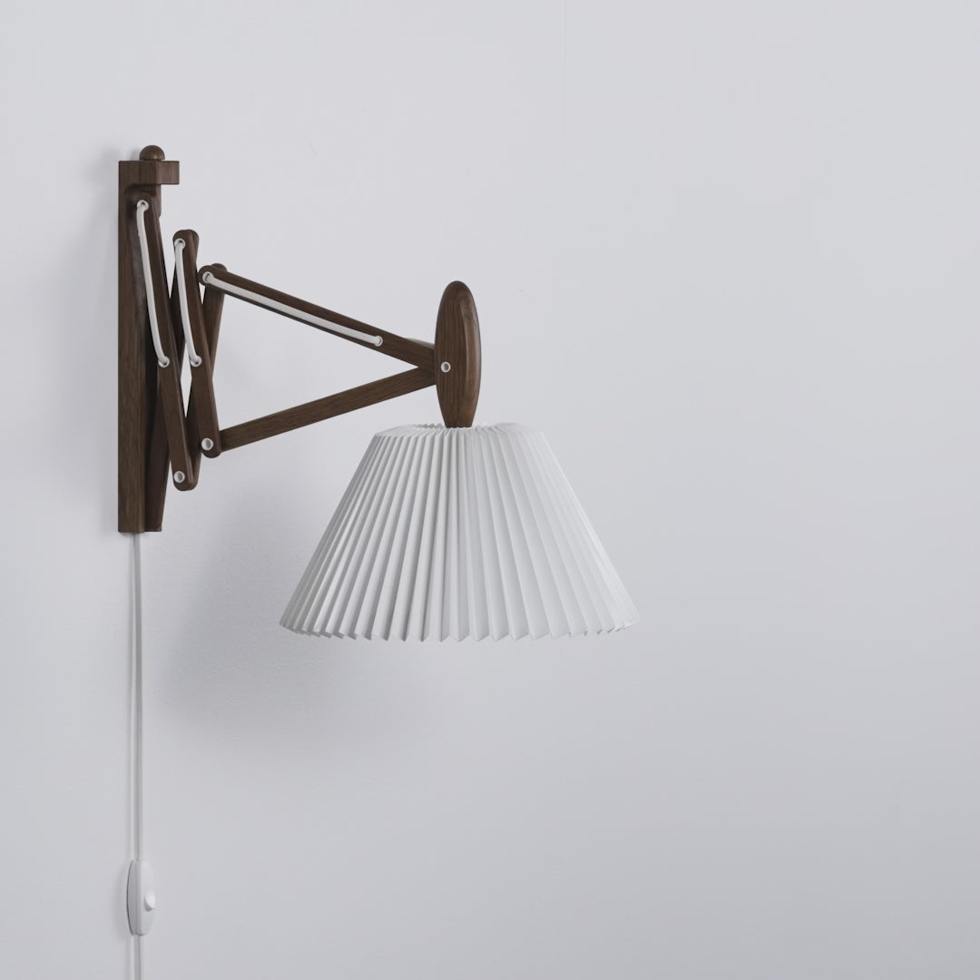 335 Sax Le Klint är en gammal bekant inom modern design från Erik Hansen. Den klassiska veckade skuggan och den högblankt lackade trähållaren lyckas kombinera det traditionella utseendet med en modern twist. Trähållaren finns i fem olika färger, så att du kan hitta den som passar din inredning bäst. Den veckade skuggan är nedåtriktad och kastar därmed ett brett, klart ljus under sig. Tillsammans med sin saxram, som kan dras ut och in, gör det vägglampan 335 Sax till den perfekta läslampan. Lampan finns även med den veckade skärmen placerad ovanför trähållaren.