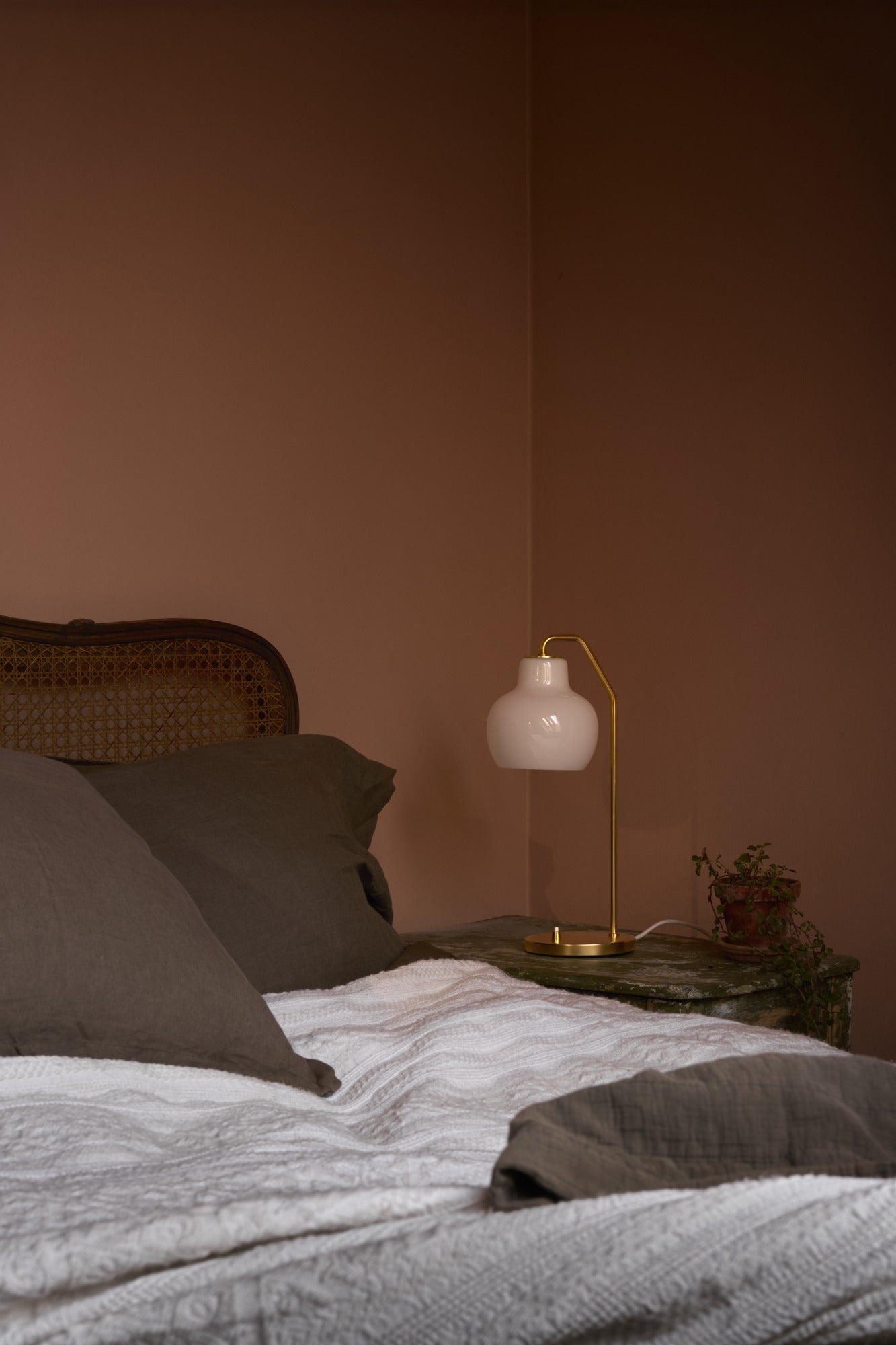 Med en diameter på 150 mm og sin kompakte form, er den velegnet til skrivebordet, sidebordet eller i soveværelset. Den massive messingbase patinerer smukt over tid og giver lampen et levende udtryk, der kun bliver smukkere med årene.