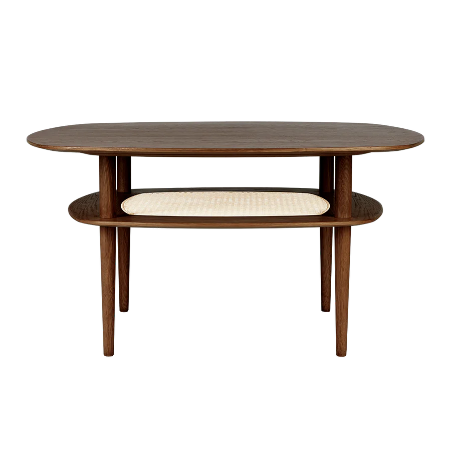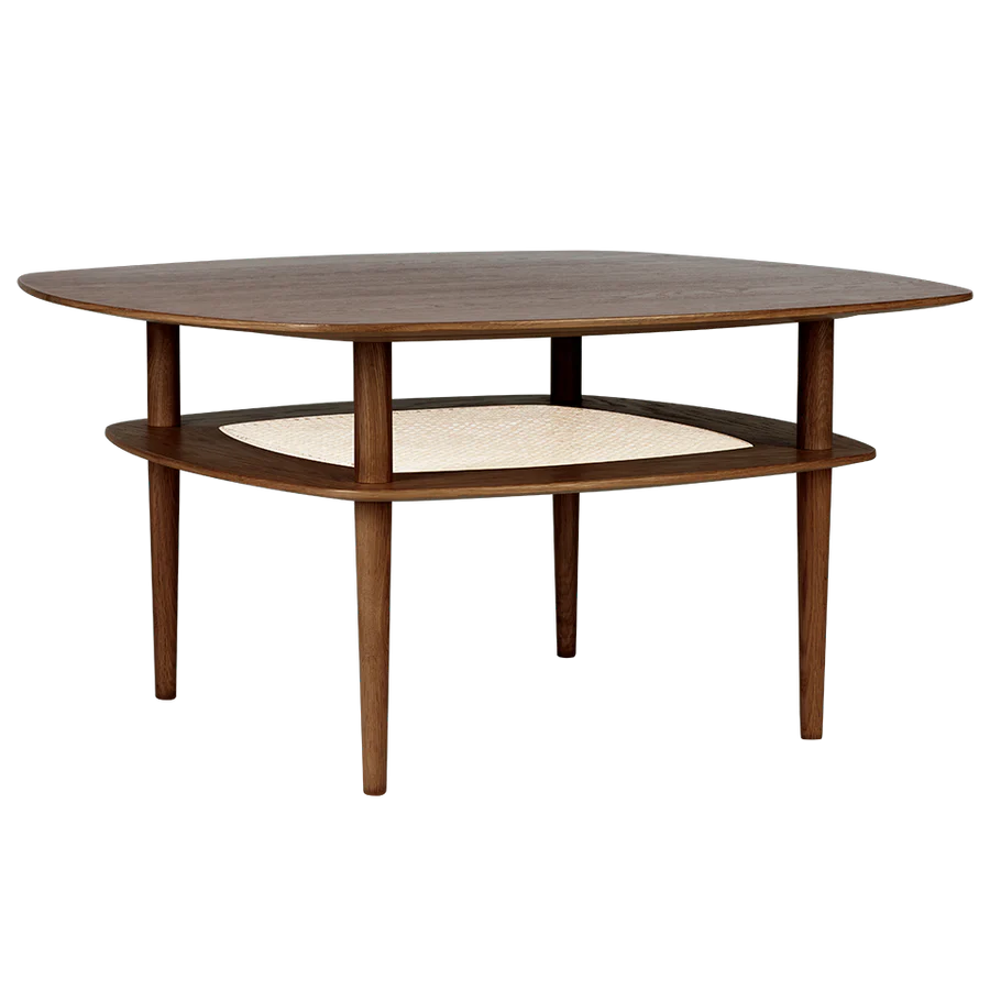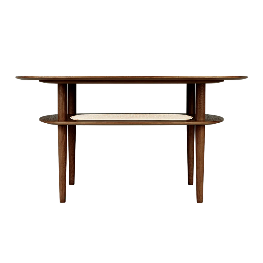 Together Smooth Square sofabord kombinerer elegant dansk design med funktionalitet. Det er fremstillet i egetræ og hæver stilen i stuen med sin afrundede form og praktiske hylde i venetiansk flettet cane. Hylden under bordpladen skaber ekstra opbevaringsplads til magasiner, laptop eller småting. De indtrukne ben øger sikkerheden i hjem med børn og beskytter dine tæer mod at støde ind i hjørnerne.